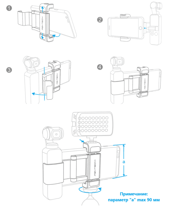 DJI Osmo Pocket и Pocket 2 — прекрасный девайсы, которые можно рекомендовать каждому, однако производитель плохо продумал крепление дополнительных устройств, особенно смартфона. Предполагается, что смартфон будет соединяться с мини камерой посредством стандартного разъёма, без какой-либо дополнительно поддержки. Крепление для смартфона к OSMO Pocket призвано решить данную проблему. Алюминиевое крепление прекрасно фиксирует смартфон шириной до 90 мм и OSMO Pocket / Pocket в одно движение.
