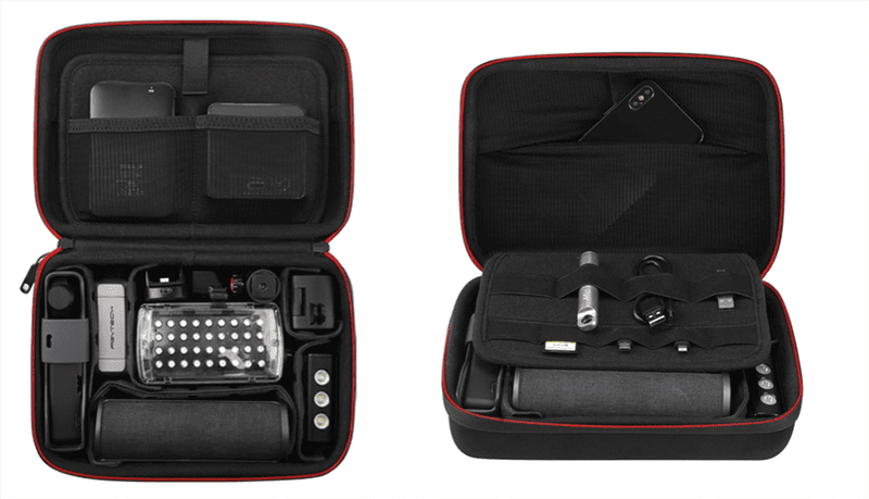 нейлон/EVA/металлКейс для DJI Osmo Pocket вмещает в себя не только сам стэдикам, но и множество аксессуаров для него. Кейс выполнен из высокопрочного нейлона снаружи, внутри кейс выполнен из трёхслойного EVA материала. Кейс имеет 2 отделения, 1 отделение предназначено для крупных аксессуаров и самого DJI Osmo Pocket. Отделение можно трансформировать так, как вам нужно за счёт того, что внутренние перегородки на липучках. Второе отделение представляет собой некий кармашек с различного рода "сеточками" и допкарманами, для дополнительных аксессуаров. Молнии на данном кейсе водонепроницаемые, а значит вы можете быть спокойны за сдержимое в небольшой дождь.