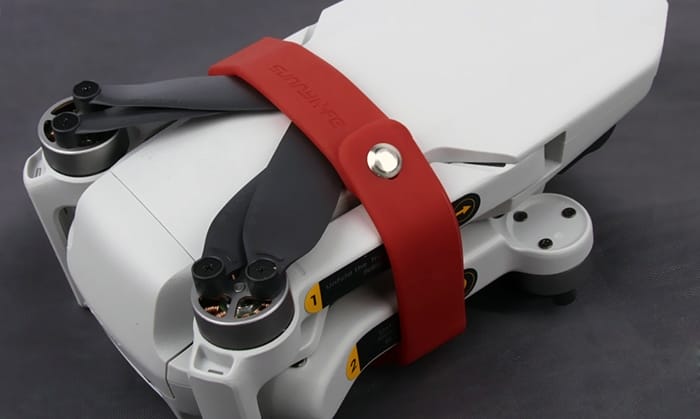 Установка фиксатора очень проста — лента из мягкого силикона плотно обхватывает лопасти дрона, не царапая ни их, ни корпус квадрокоптера.