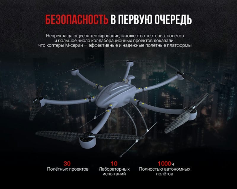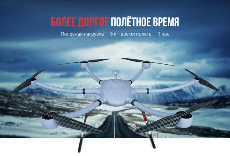 - Время полёта: с нагрузкой в 5 кг — более 55 минут, с нагрузкой в 10 кг — более 41 минуты