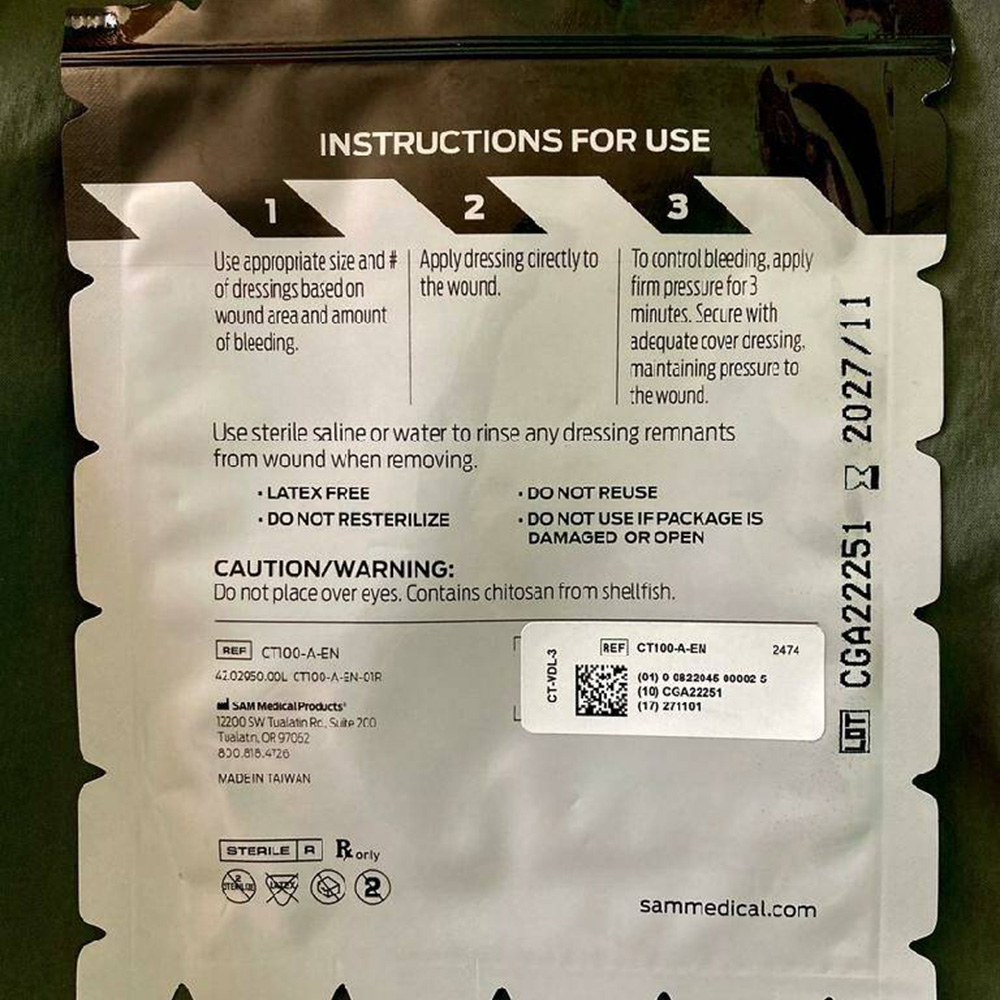 Хитозан – это уникальный кровоостанавливающий материал, который вызывает локализованное свертывание крови. Он не является прокоагулянтом, который участвует или стимулирует естественный процесс свертывания. Это минимизирует риск эмболизма. Также хитозан известен своими антимикробными свойствами. Он разлагается и выводится естественными метаболическими путями. Хитозан давно и эффективно используется для перекрытия травмированных сосудов, а также в кардиологической хирургии. В отличие от большинства кровоостанавливающих повязок, Chito SAM полностью изготовлена из натурального нетканого хитозана. Независимые исследования доказали, что Chito SAM на 25% эффективнее, чем повязки, обогащенные хитозаном. Благодаря для остановки кровотечений требуется меньшее количество марли. Также уникальная упаковка Chito-SAM, которую можно разорвать в любом месте, гарантирует быстрый доступ к повязке для оперативной остановки кровотечений.