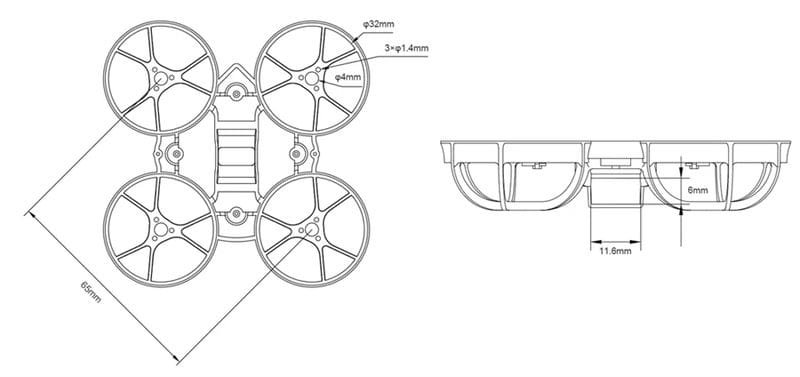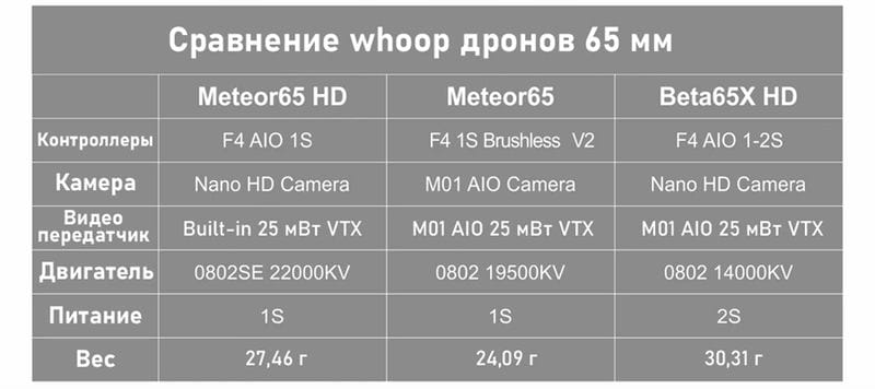 - Meteor65 HD – это сверхлегкий 1S HD дрон , который весит всего 27,46 г без аккумулятора, что дает хороший баланс веса и хорошее влияние на аккумулятор 1S. Дрон мощный, гибкий и достаточно маленький для облёта препятствий, а также маневренный для FPV-полетов .
