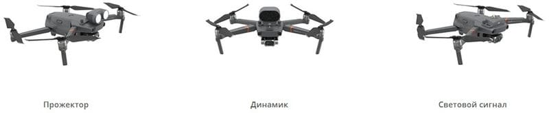 Как и у обычного DJI Mavic 2 Enterprise, у Dual версии есть возможность устанавливать прожектор яркостью 2400 люмен, динамик мощностью 100 дБ и световой маячок, видимый на расстоянии до 6 км.