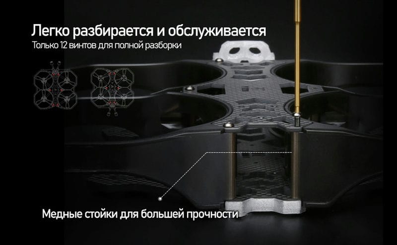 - Портативная компактная конструкция, легко разбирать и переносить. Чтобы полностью разобрать дрон, надо открутить только 12 винтов.