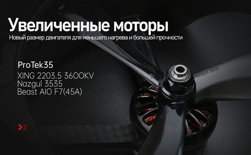 ProTek — это серия синевупов с большей производительностью и лёгким весом. Максимальная скорость — выше 120 км/ч, максимальная мощность — 750 г на двигатель (всего 3 кг), подходит даже для более тяжелых камер, чем GoPro.