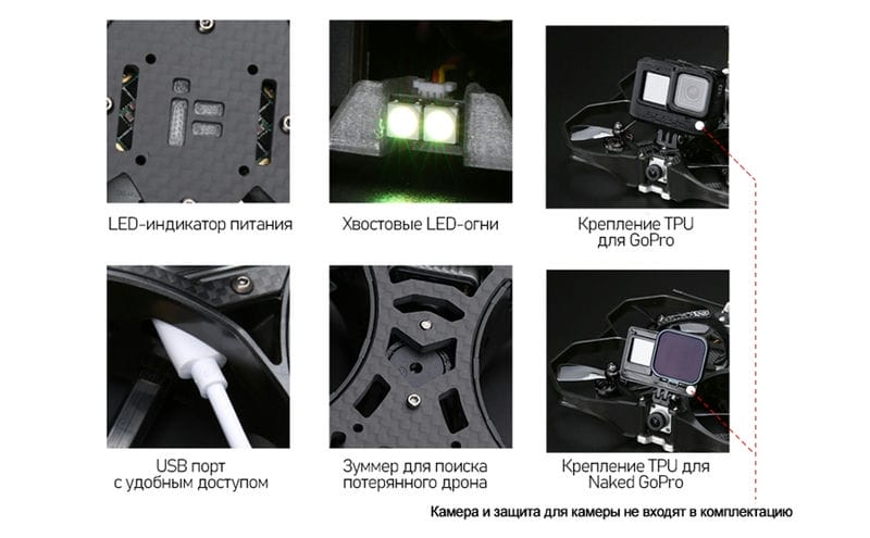 - Универсальное TPU крепление для камеры (полноразмерная или Naked GoPro).