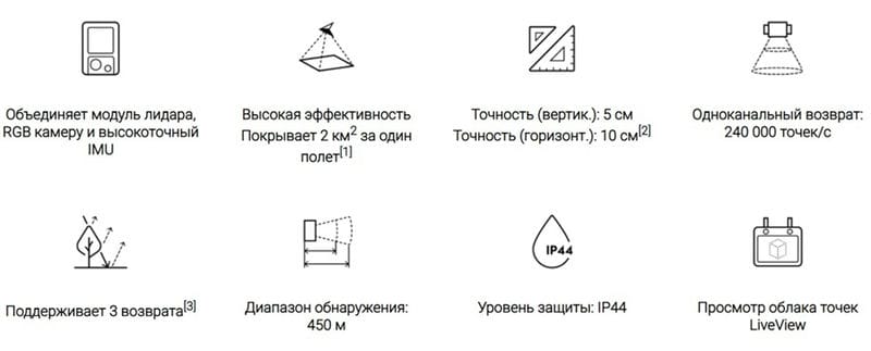Исключительная эффективность. Формируйте облака точек с истинным цветом в режиме реального времени, или собирайте данные о 2 км² в виде облака точек за один полёт используя модуль лидара Livox с углом обзора в 70° и камерой видимого диапазона с 1-дюймовой матрицей.