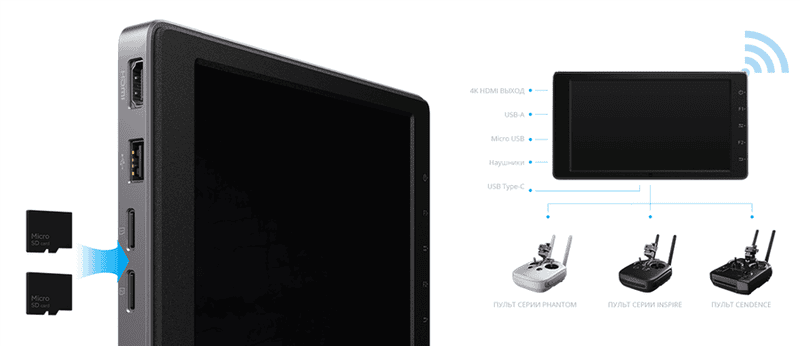 CrystalSky оснащен двумя слотами для карт памяти microSD. Наличие двух карт значительно расширяет возможности. Память устройства позволяет использовать дисплей для хранения, просмотра и обработки записанного материала с помощью редакторов, встроенных в приложение DJI GO.