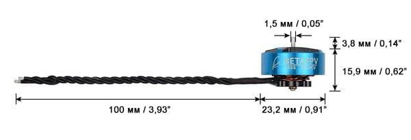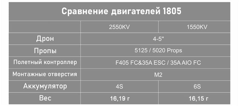- Для экономии веса у мотора 1805 1550KV сохранена конструкция вала диаметром 1,5 мм вместо вала с резьбой, поэтому для фиксации пропеллеров требуются винты M2, в то время как на рынке в большинстве случаев 4-дюймовые пропеллеры фиксируются гайками.