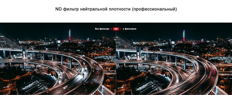 - Фильтр ND8 пропускает 1/8 света, его можно использовать при слабой освещённости, когда нужно придать плавность кадрам.