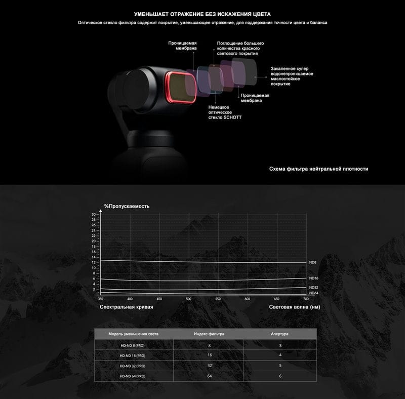 Все фильтры версии Professional Osmo Pocket / Pocket 2 имеют следующие одинаковые особенности: