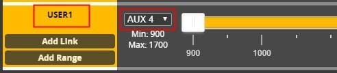 resource FLASH_CS 1 NONEresource PINIO 1 B12set pinio_box = 40,255,255,255saveЗатем сопоставьте один из каналов тумблеров в пульте с Pinio (он же USER1). Как показано ниже, канал AUX4 в пульте сопоставляется с USER1 Pinio. Курсор в оранжевой зоне означает, что кнопка отпущена, в белой – что кнопка нажата. Держите курсор в оранжевой зоне по умолчанию.