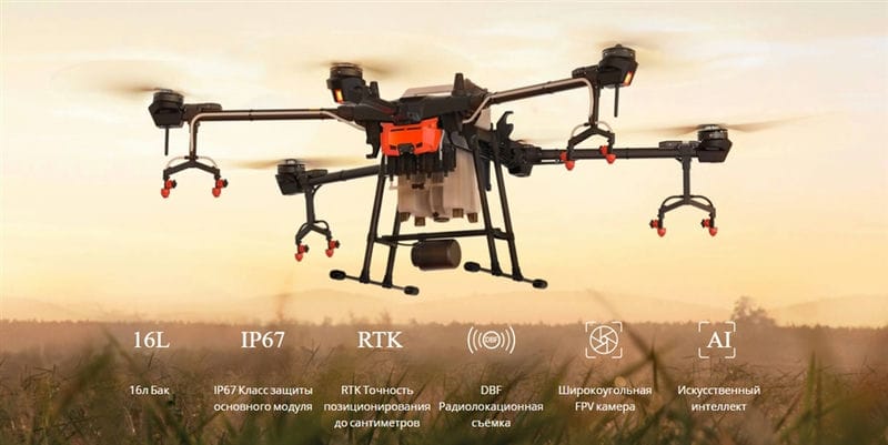 Agras T16 имеет улучшенную модульную конструкцию, способен переносить самую тяжёлую полезную нагрузку и имеет самую широкую зону распыления среди всех сельскохозяйственных дронов DJI. С высокопроизводительными компонентами, искусственным интеллектом и 3D планированием полётов T16 выводит эффективность работы на совершенно новый уровень.