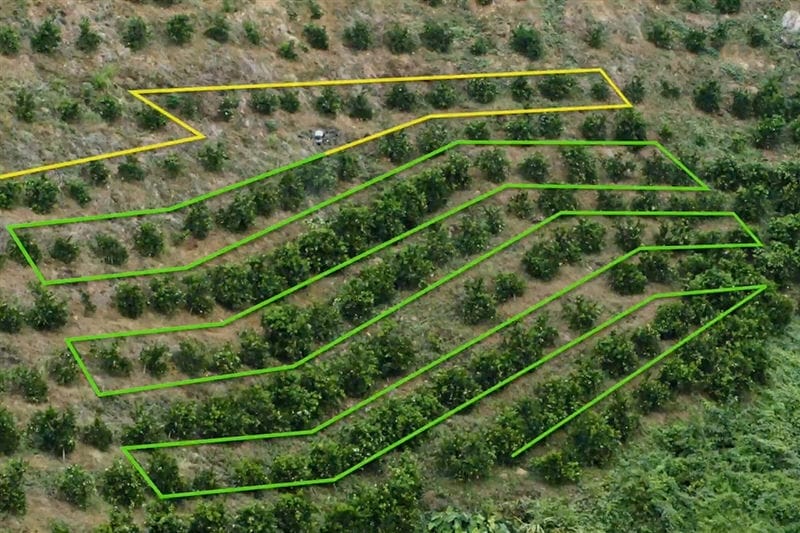 Функция 3D планирования маршрута упрощает навигацию над сложным рельефом. Phantom 4 RTK выполняет точное сканирование рабочих областей и создает детальные карты, чтобы упростить обнаружение всех объектов на поле. Если у вас есть садовые насаждения, то в режиме «Сад» можно сгенерировать 3D маршрут полета с учетом формы каждого дерева. После этого Т20 может успешно выполнять распыление.