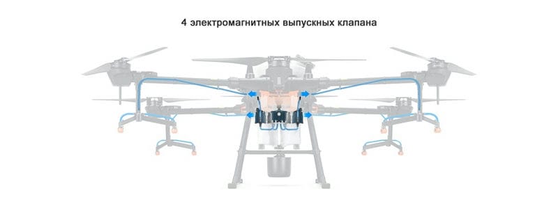 Благодаря 8 соплам (распылителям) и насосам большой емкости скорость распыления в Т20 увеличилась до 6 л/мин. А оптимизированное ветровое поле в процессе обработки создает капли идеального размера и консистенции. Установленный на Т20 4-канальный электромагнитный расходомер помогает отследить и проконтролировать каждый из 4 шлангов, что обеспечивает подходящую скорость распыления на каждом сопле.