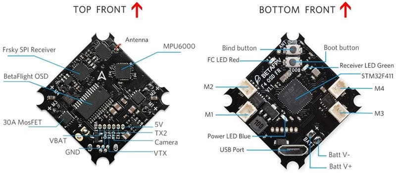 - Плата полётного контроллера поставляется с предварительно установленной прошивкой Betaflight и припаянным кабелем питания диаметром 55 мм с разъёмом JST-PH 2.0, также известным как PowerWhoop.