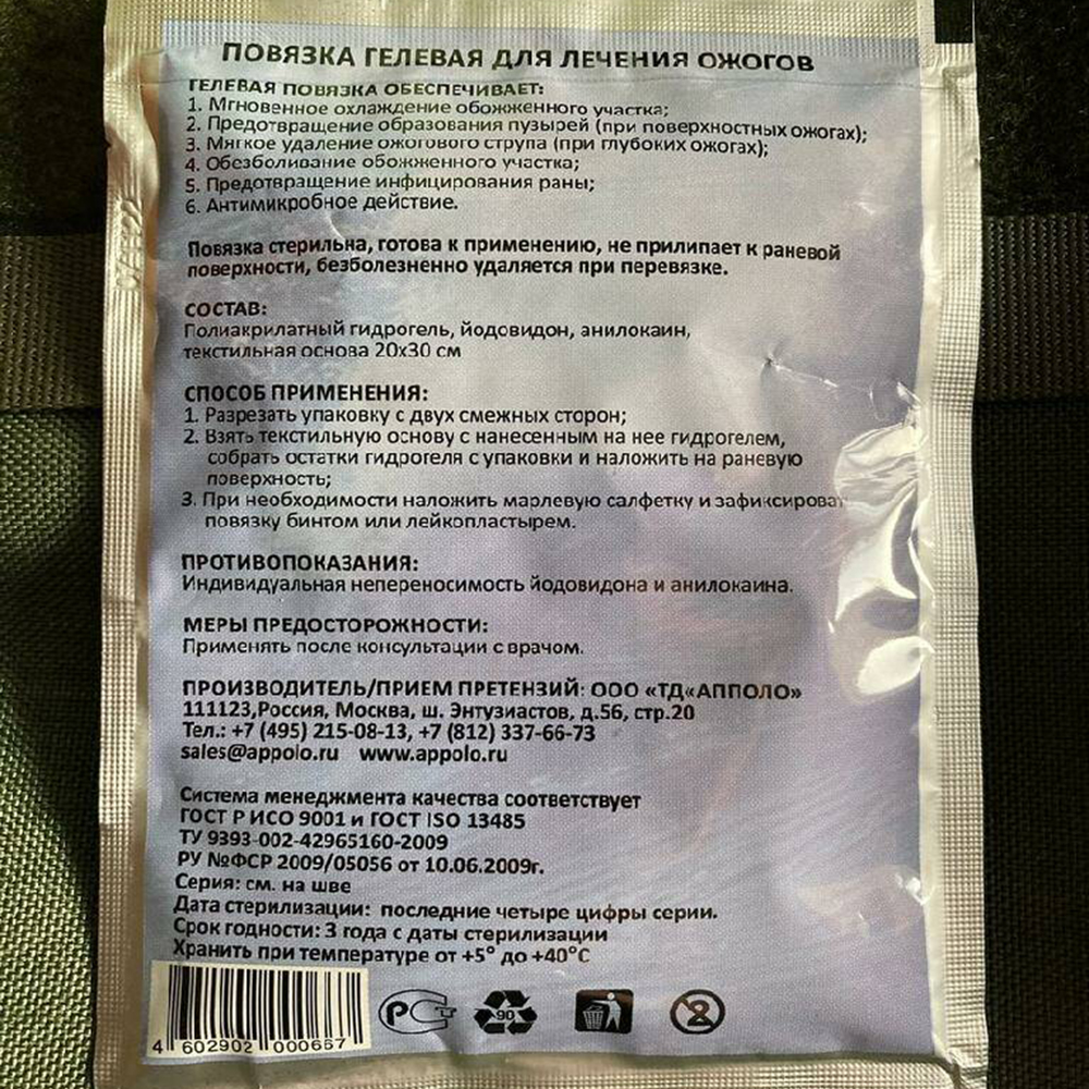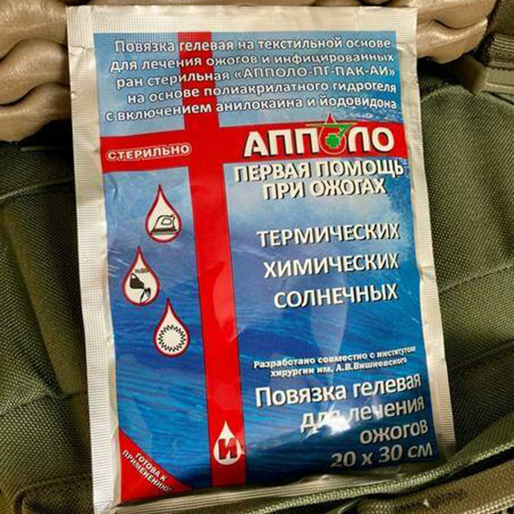 Противоожоговая гелевая повязка "Апполо" 20 х 30 см предназначена для оказания первой помощи при ожогах и лечения ожоговых ран 2-3 степени. Лечение ожогов с применением противоожоговых повязок предотвращает развитие такого заболевания, как Ожоговая болезнь. Гидрогель "АППОЛО" - оптимальное и максимально эффективное средство от ожогов. Средство от ожогов обязано обладать специфическими свойствами, чему соответствует гидрогель. Разработан совместно с российским институтом хирургии им. А.В. Вишневского (регистрационное удостоверение №ФСР 2009/05056).