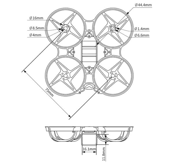 75 ммРама второй версии Beta75X V2 весит всего 5,6 г, она легче и центр тяжести у неё более концентрированный. Поддерживает бесколлекторные моторы 1102 и 1103.