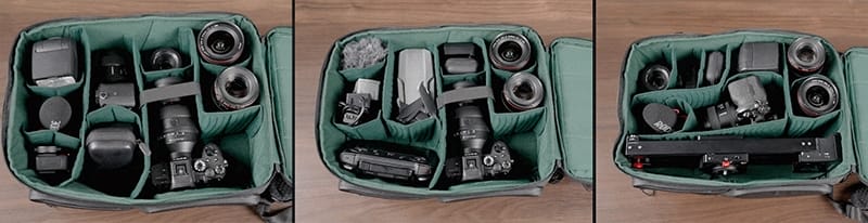Открывается широко, предоставляя доступ сразу ко всему оборудованию в основном отделении. Предусмотрены отсеки для быстрого доступа, чтобы можно было моментально достать аппаратуру и начать снимать. Также что-то (например, складной штатив) можно крепить снаружи на специальные ремни.