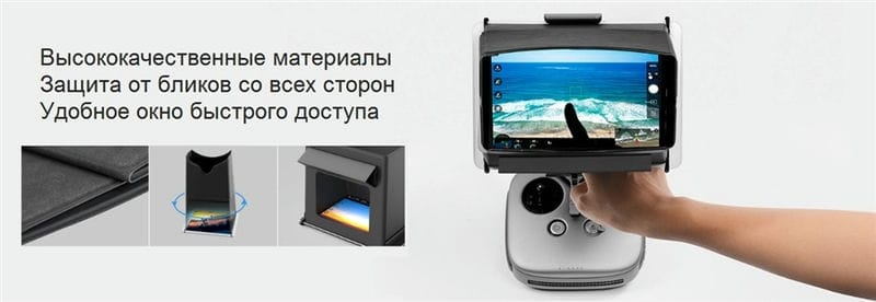 9.7".Солнцезащитная шторка на пульт дистанционного управления для использования с планшетом 9,7 дюймов. Быстрая установка с помощью силиконовых фиксаторов и магнитных застежек, а также возможность выбора положений, в зависимости от освещенности, поможет полностью сосредоточиться на полете и забыть о солнечных бликах.