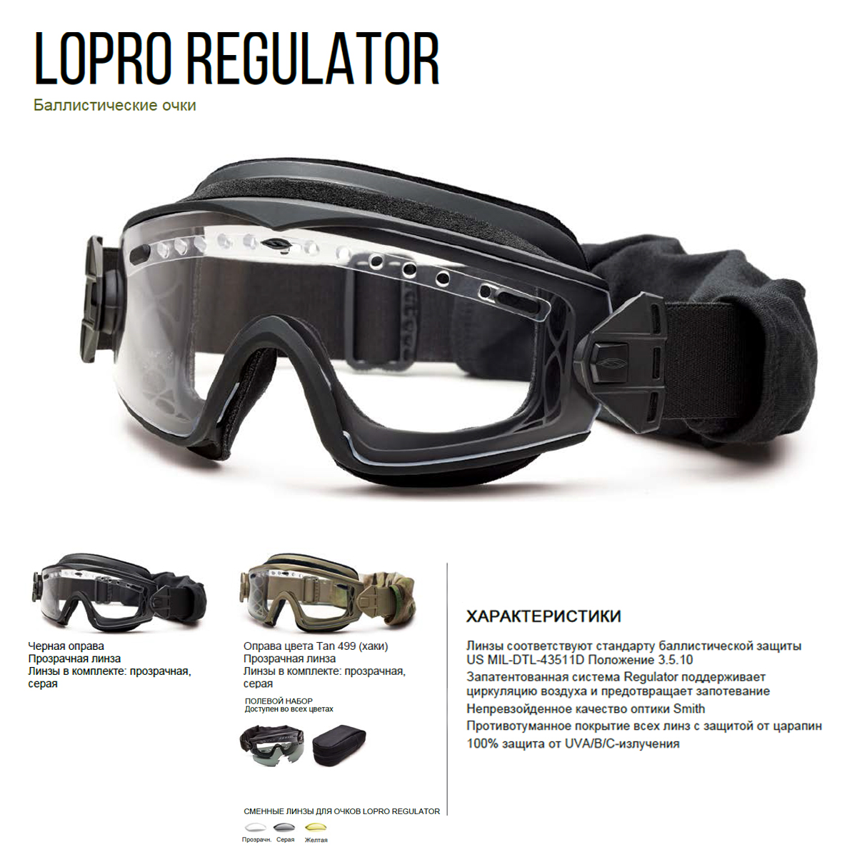 Тактические очки Smith Optics Goggle LOPRO с естественной вентиляцией стали первой моделью в новой серии Tactical Regulator. Они были созданы для выполнения двух основных задач – подходить под системы ночного видения без оптической интерференции и для защиты от тумана. Форма очков позволяет ветру скользить по линзам, что защищает их от воздействия тумана. LOPRO Regulator противодействуют туману, помогая вам в вашей миссии.