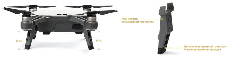высокопрочный ABS пластик / силикон (PA/GF).Удлинители посадочных шасси позволяют совершать взлеты и посадки в более жестких погодных условиях, будь то снег, песок, грязь или вода. Увеличение клиренса на 3,5 см придает дополнительную защиту камере и подвесу. За счет распределения веса и нагрузки исключено опрокидывание дрона во время взлета и посадки.