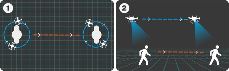 - Умное следование (2). Дрон активно отслеживает позицию объекта, удерживая угол постоянным. При этом камера всегда направлена на объект.