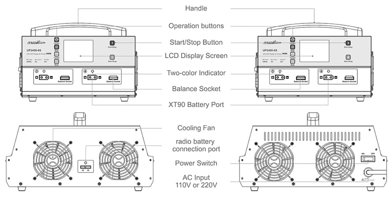 110 В или 220 В переменного токаЗарядное устройство UP2400-6S специально разработано для зарядки LiPo / LiHV аккумуляторов больших дронов, оно может заряжать и переводить в режим хранения до 4-ёх аккумуляторов одновременно. Благодаря функции «зарядка одной кнопкой», оно крайне простое в использовании. Кроме того, UP2400-6S имеет защиту от перенапряжения, перегрузки по току, обратной полярности и перегрева.